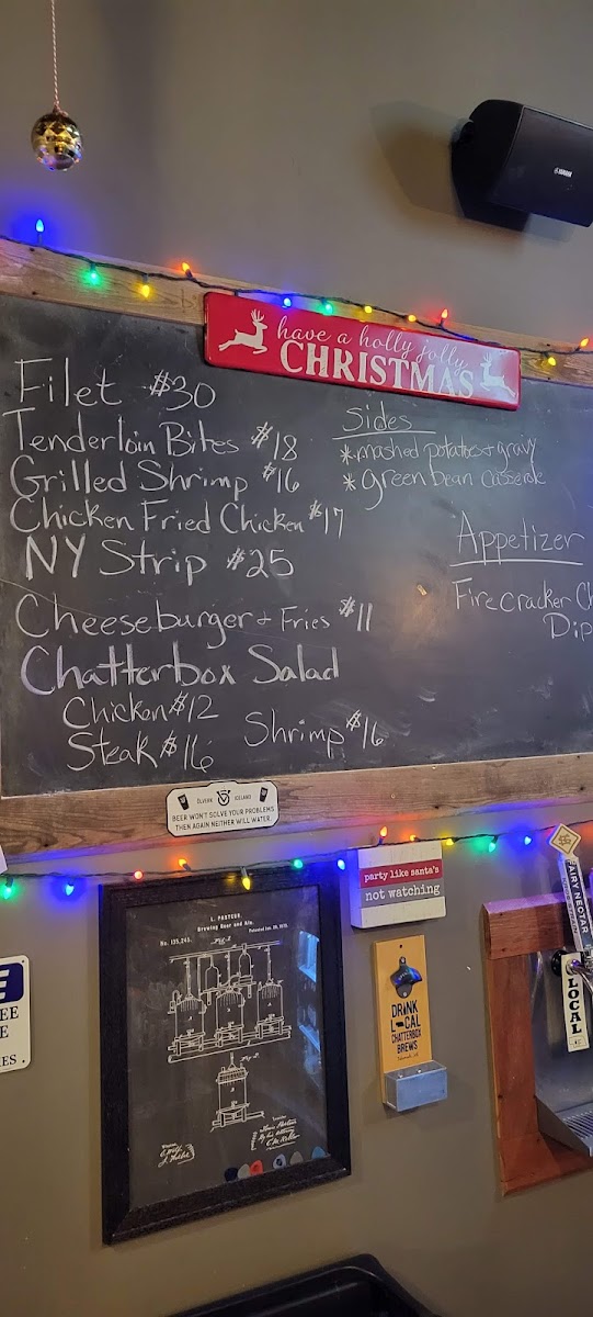 The menu at Chatterbox Brews offers a delightful mix of flavorful dishes, catering to various tastes and preferences. Starting with the Tenderloin Bites, these tender pieces of meat make for a perfect appetizer, while the Buffalo Chicken Dip is a savory and creamy treat that pairs wonderfully with chips or crackers. If you're craving seafood, the Grilled Oysters Bacon with Blue Cheese and Garlic Parmesan delivers an indulgent combination of rich flavors, or you can opt for the Shrimp with Cheesy Potatoes and Green Bean Casserole for a heartier dish.